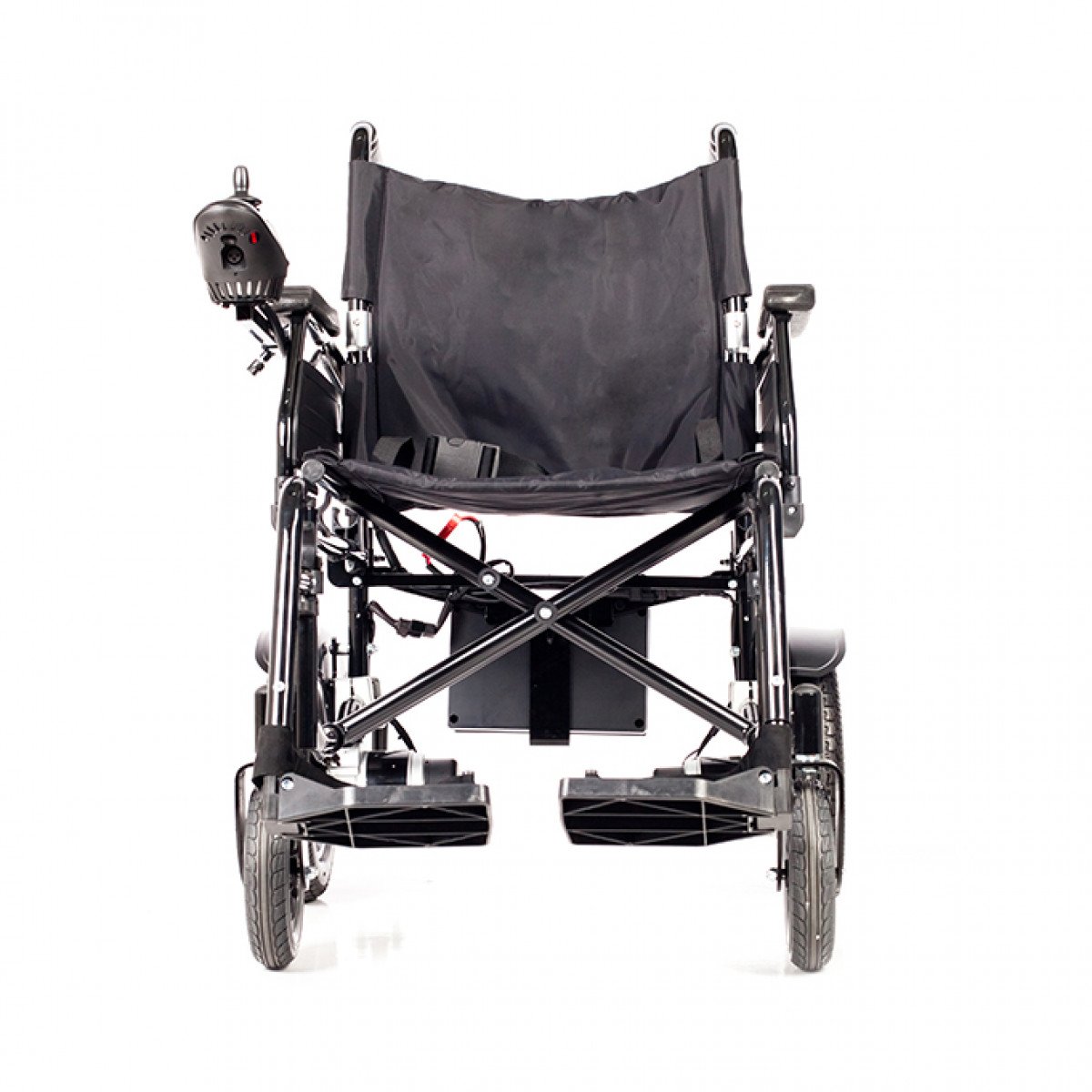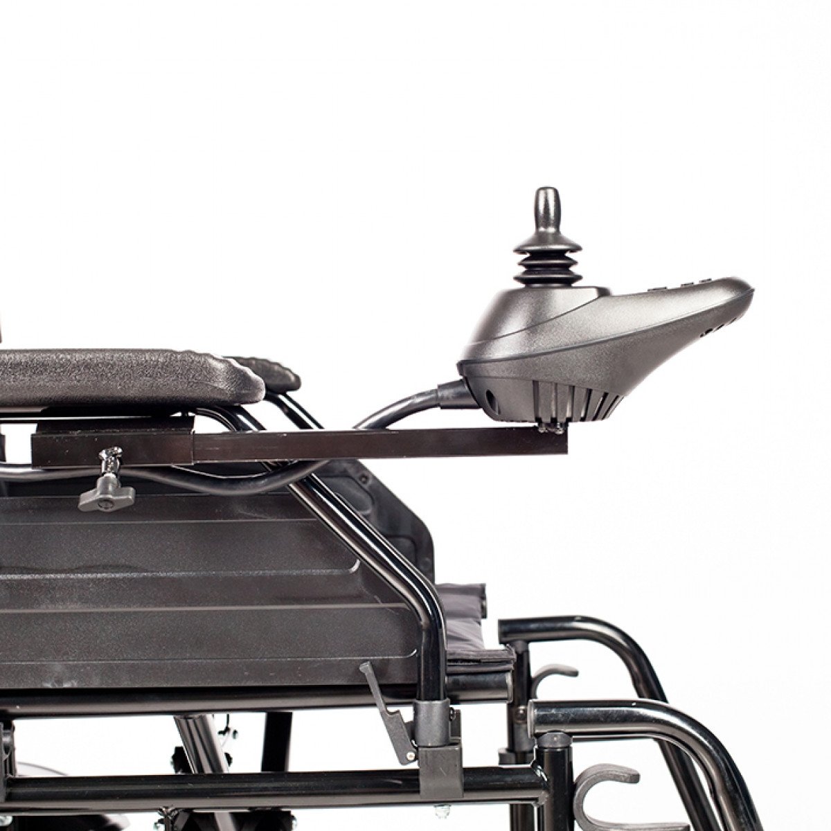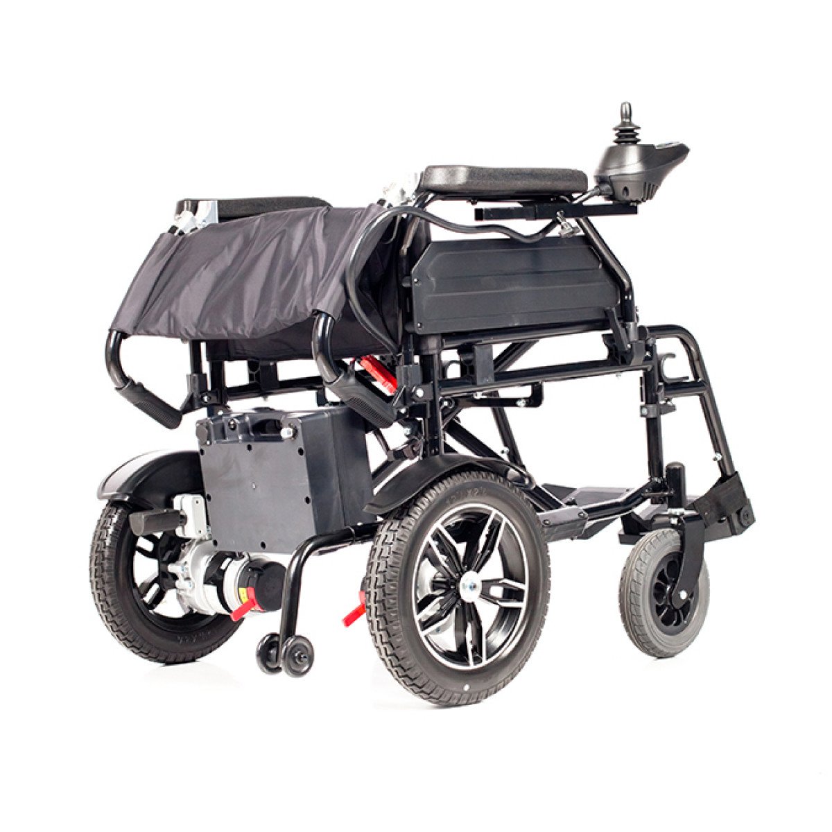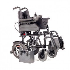 Коляска проста в использовании: пульт управления можно установить с удобной стороны и настроить по вылету, а при отключении электропривода модель легко переводится в режим сопровождения. Подлокотники и подножки — съёмно-откидные, что упрощает пересаживание и настройку под пользователя. Спинка складная, а сиденье выполнено из прочного материала, который не растягивается и легко очищается.