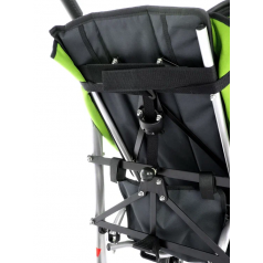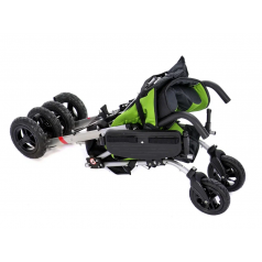 Для безопасности предусмотрены пятиточечный ремень и защитный поручень. Сдвоенные задние колёса с тормозами обеспечивают устойчивость, а передние — манёвренность и возможность фиксации направления.
