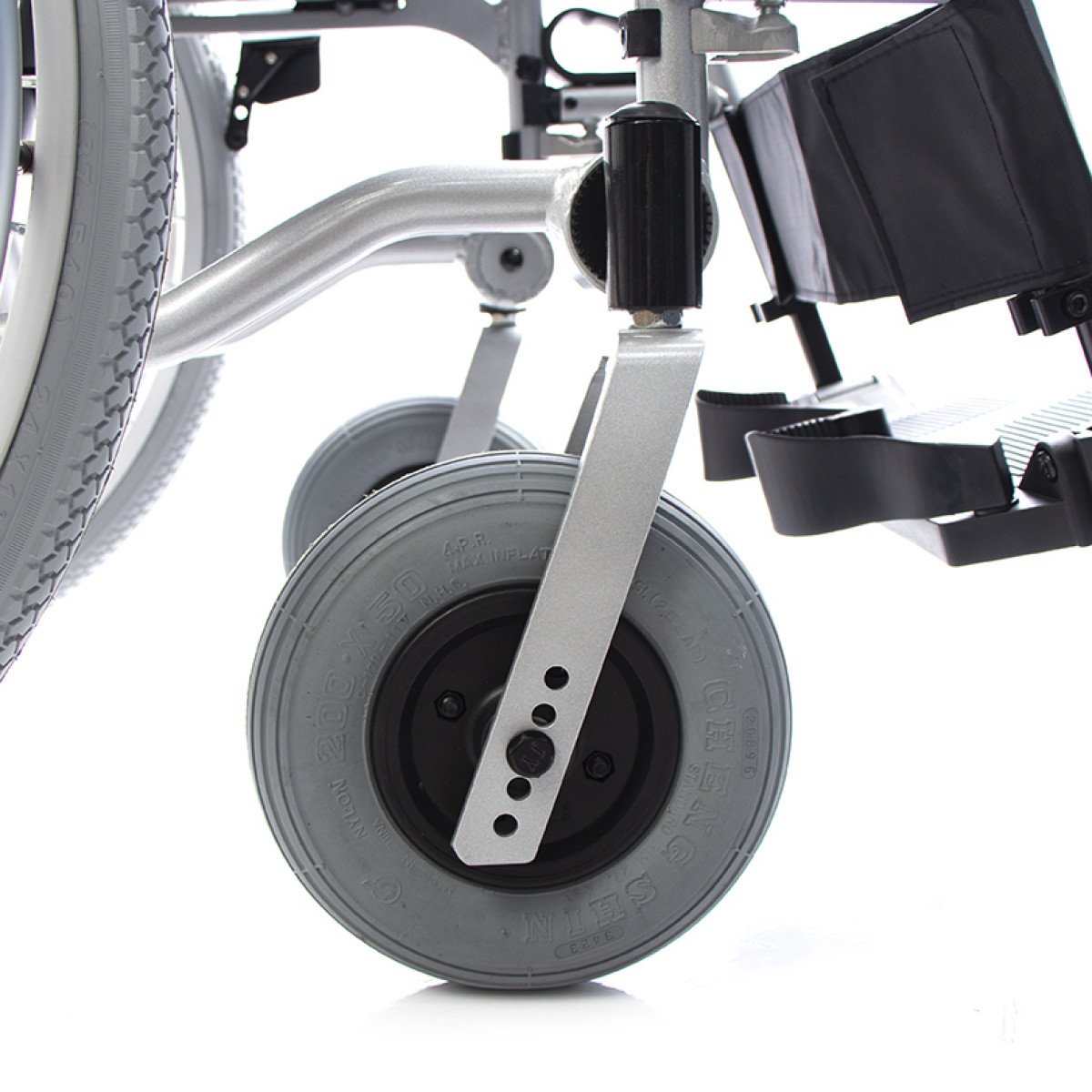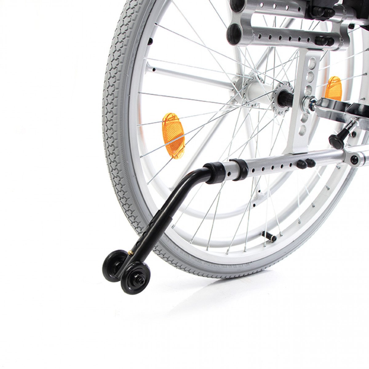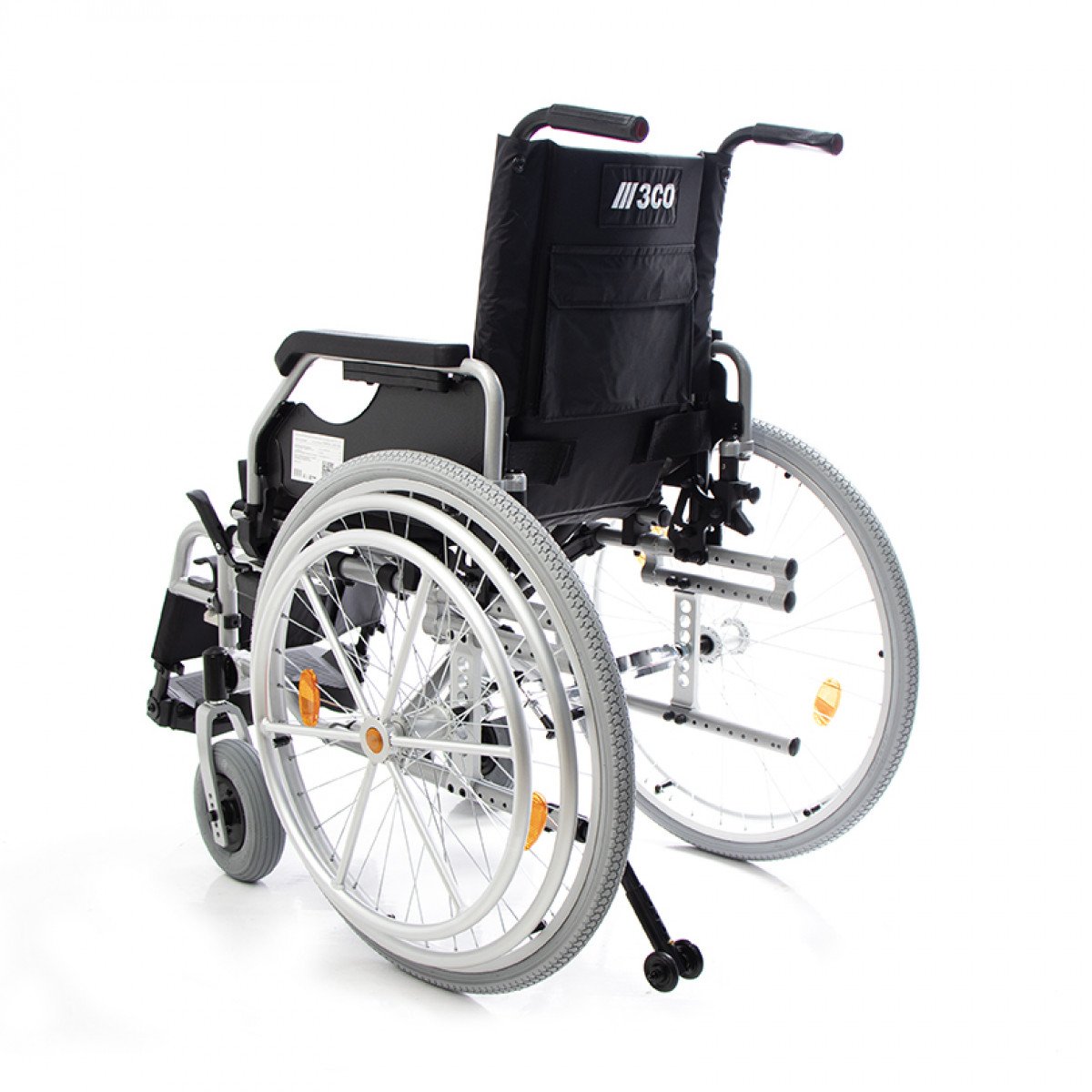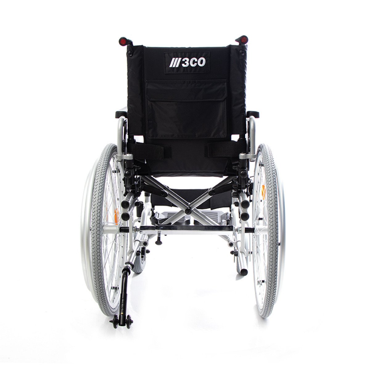 Складная рама облегчает хранение и транспортировку. Для устойчивости предусмотрен антиопрокидыватель на роликовой опоре, а ручки для сопровождающего оснащены светоотражателями — это повышает безопасность при передвижении в тёмное время суток.