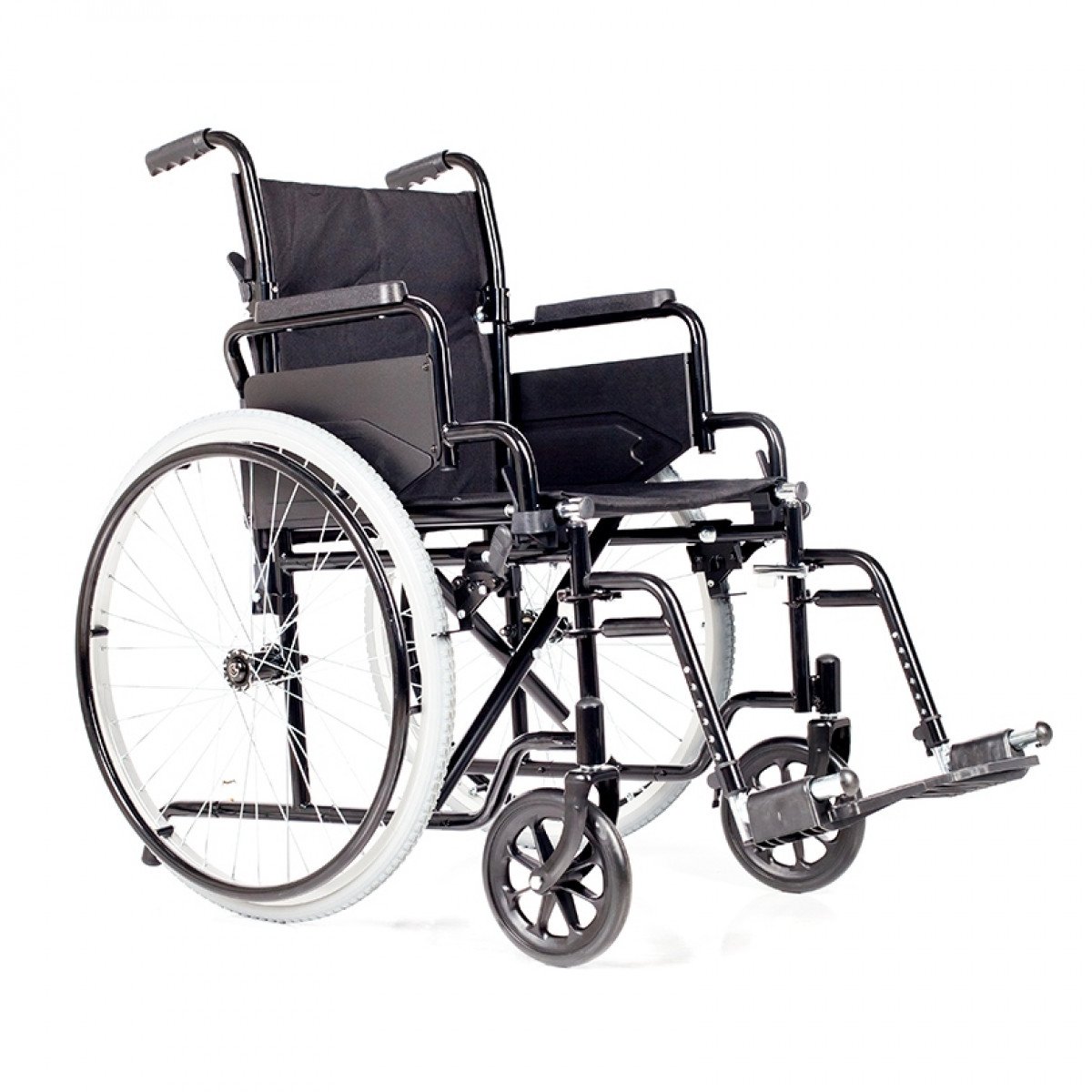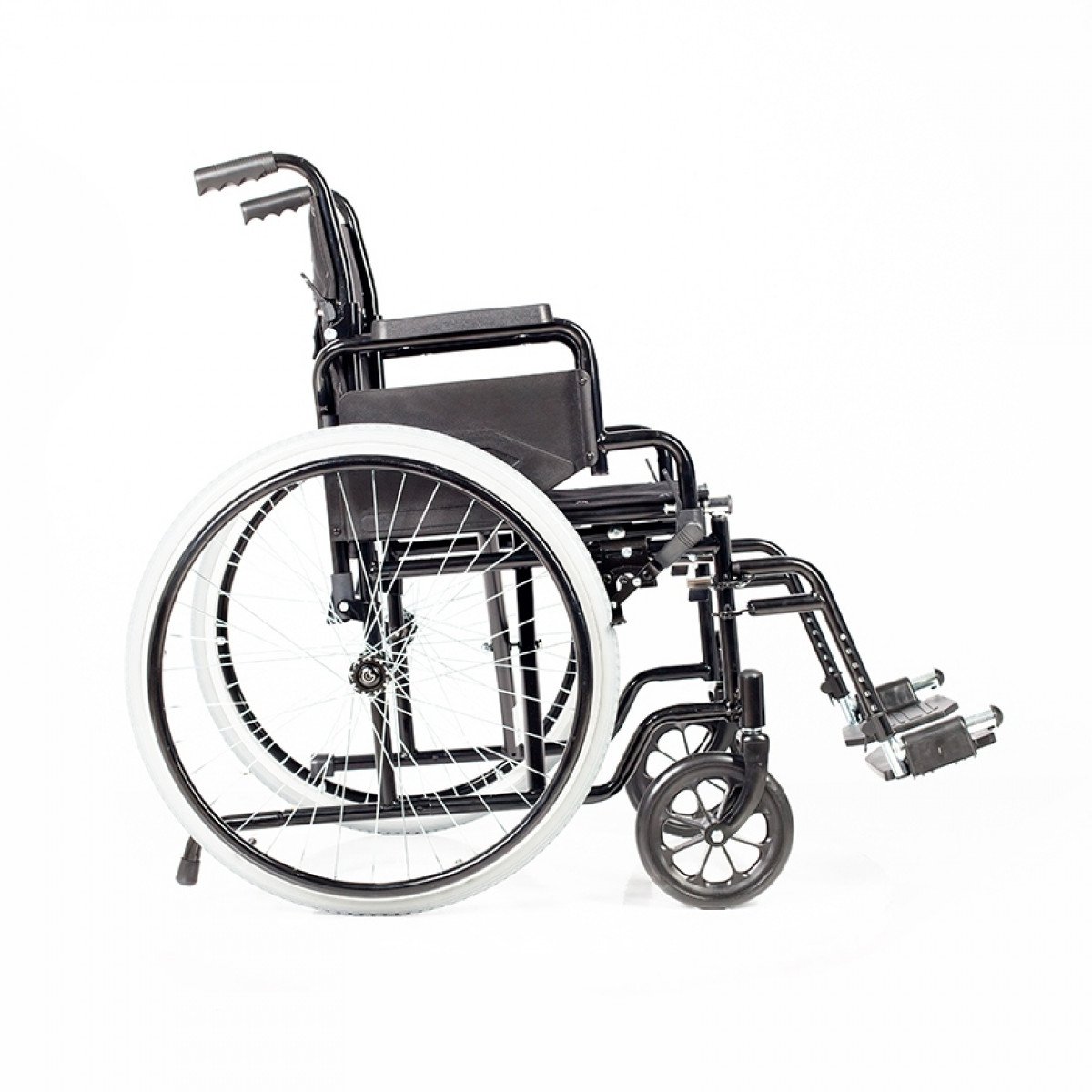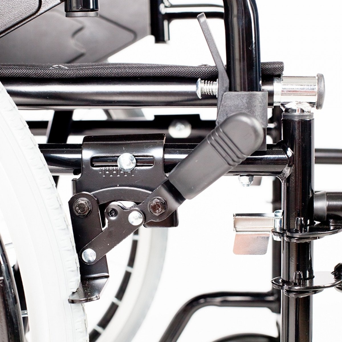 Задние колёса — быстросъёмные, с кнопочной фиксацией: их можно быстро снять, чтобы компактно разместить коляску в автомобиле. Доступны варианты с цельнолитыми или пневматическими шинами. Подножки регулируются по высоте, а также снимаются или откидываются — это упрощает пересаживание и делает использование более комфортным.