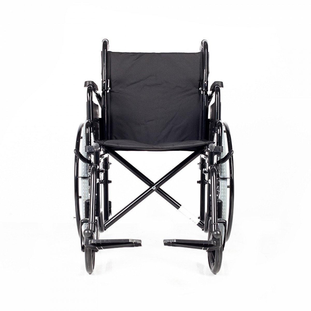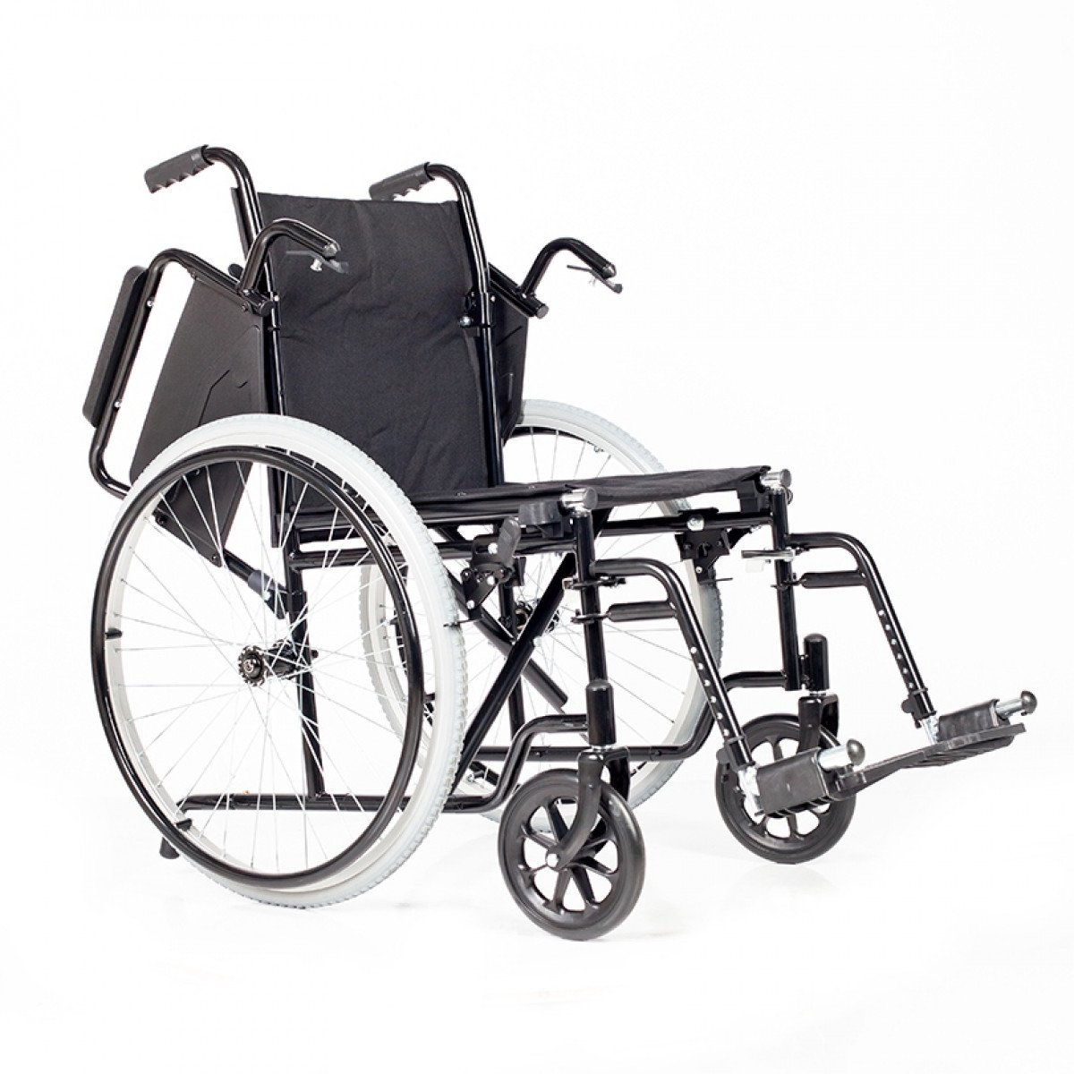 Коляска складывается без инструментов — достаточно откинуть подножки и потянуть за середину сиденья. Складная спинка дополнительно уменьшает габариты при транспортировке. Откидные подлокотники с мягкой опорой и жёсткой боковой защитой делают посадку удобнее и обеспечивают дополнительную устойчивость.