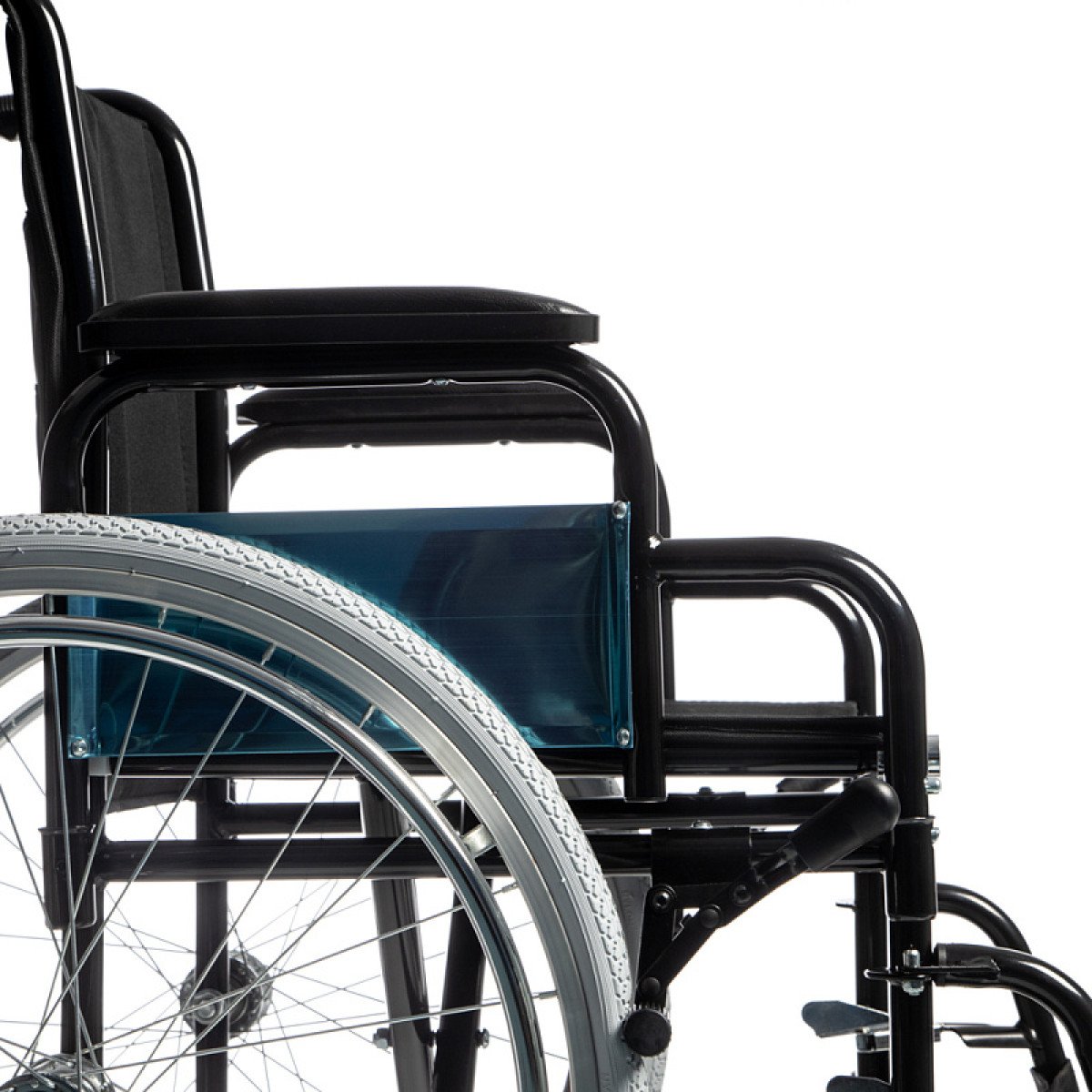 Подножки регулируются по высоте, отводятся в стороны или снимаются при необходимости. Съёмные подлокотники имеют удобную форму, позволяющую подъезжать вплотную к столу и облегчать пересадку.