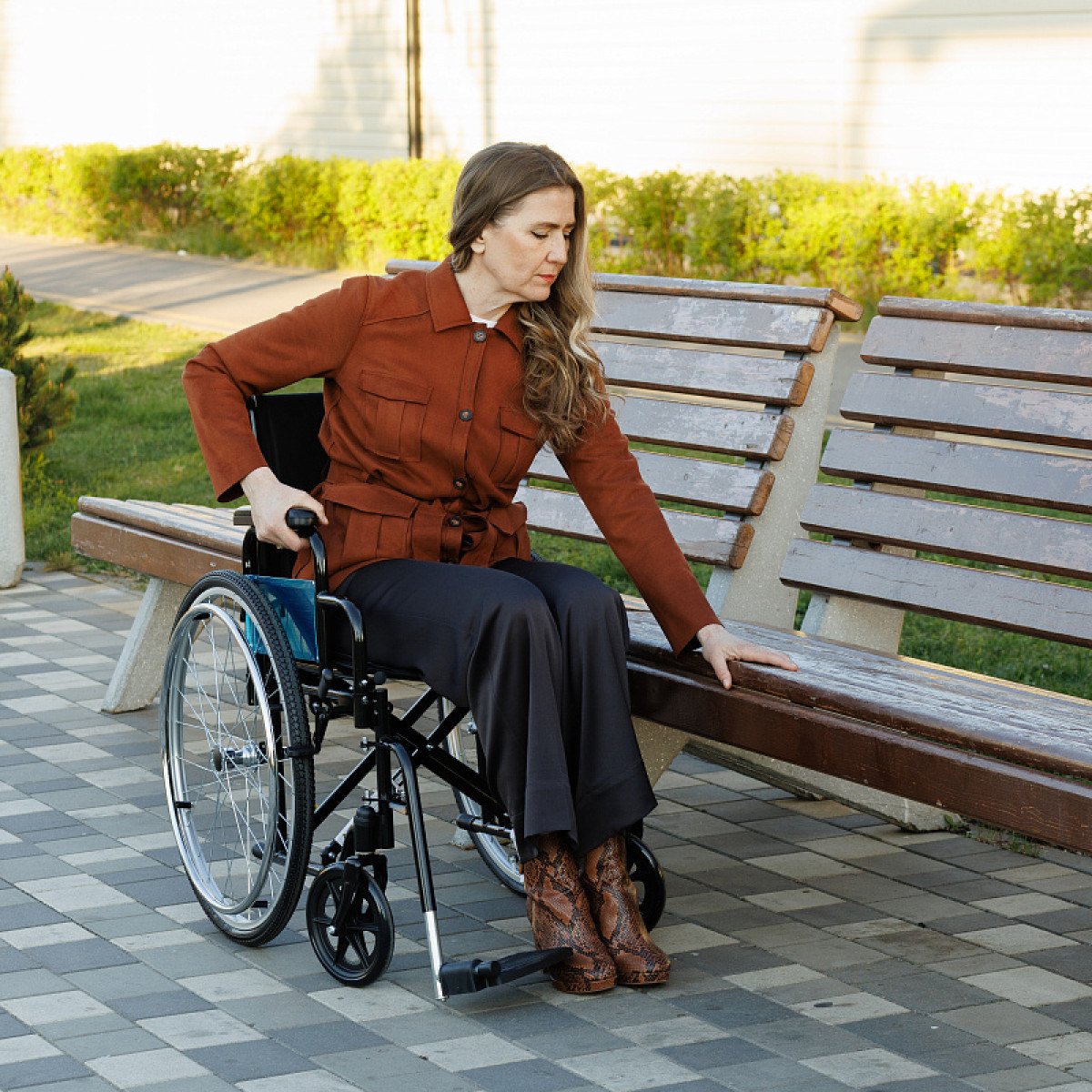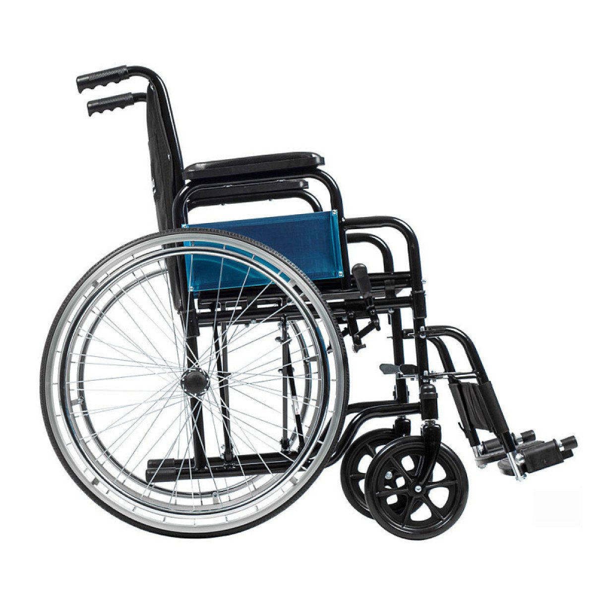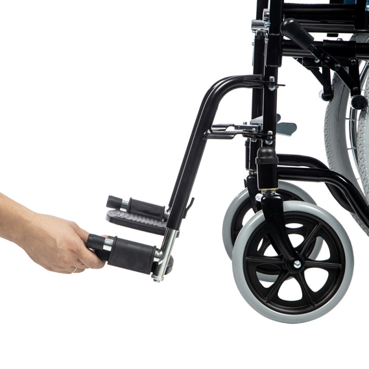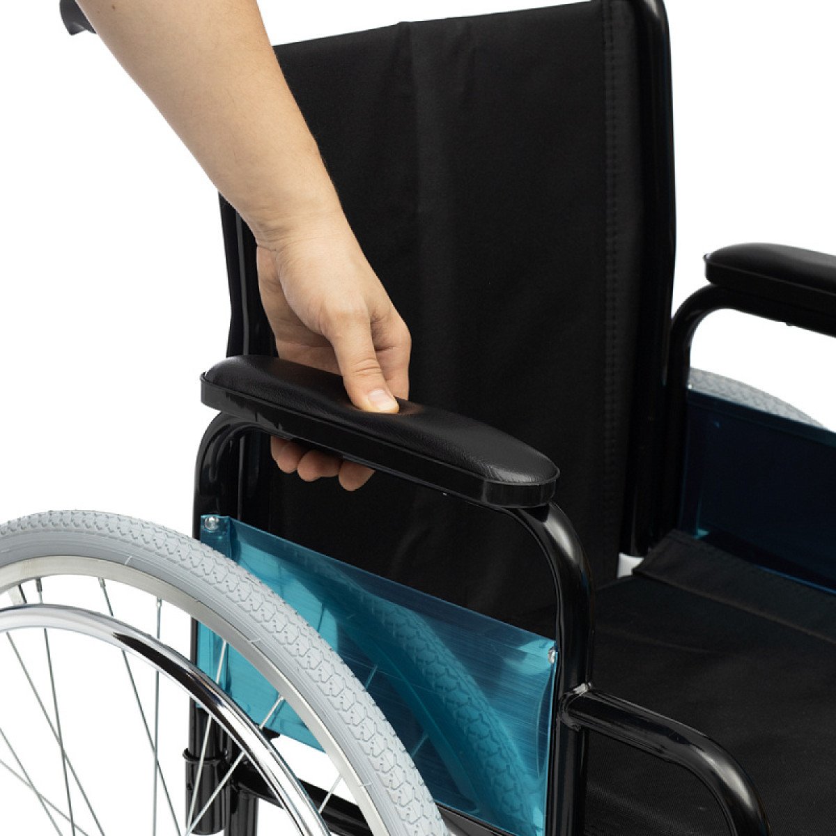 Коляска легко складывается без инструментов, а быстросъёмные задние колёса позволяют быстро подготовить её к транспортировке. Ручные стояночные тормоза обеспечивают фиксацию при остановке и делают пересаживание безопаснее. Для сопровождающего предусмотрены упоры, которые помогают преодолевать небольшие препятствия.