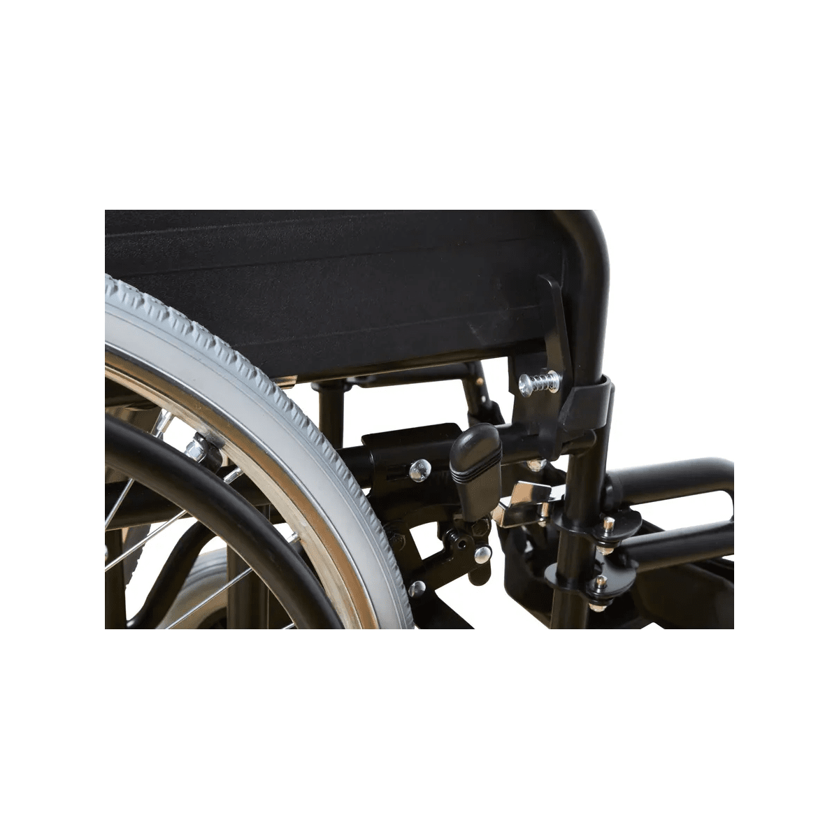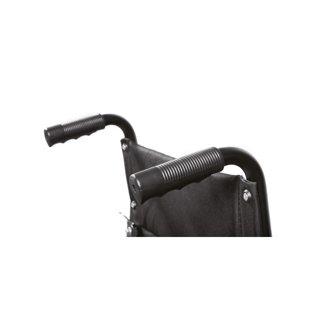 Рама выполнена из стальных труб с антикоррозийным покрытием — это про прочность и долгий срок службы. Коляска складывается без инструментов, а складная спинка помогает уменьшить габариты при хранении. Доступны варианты колёс: цельнолитые или пневматические — под разные условия использования. Для устойчивости предусмотрен антиопрокидыватель с резиновым наконечником, который делает передвижение безопаснее.