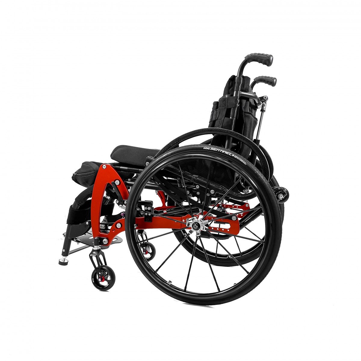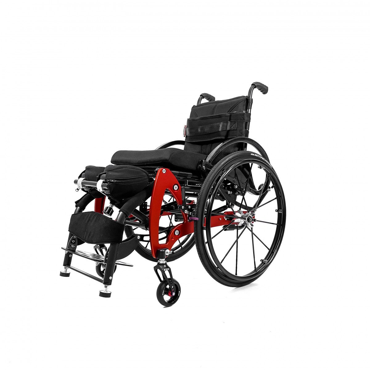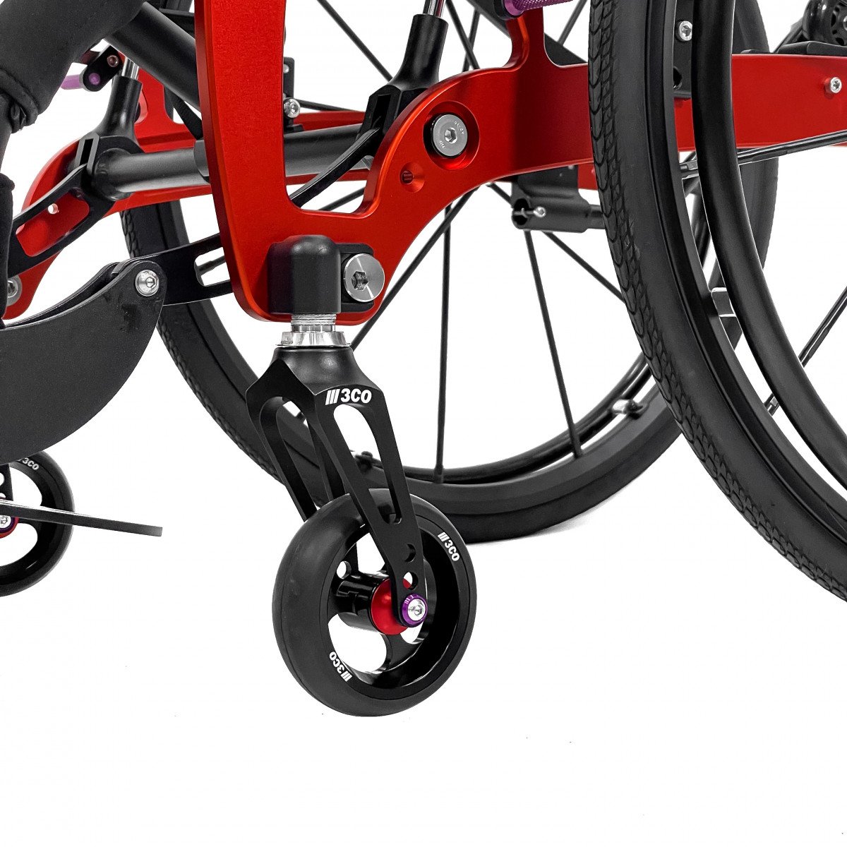 Механизм подъёма работает плавно и фиксируется в нужном положении, а ремни обеспечивают надёжную поддержку и безопасность. Вилки передних колёс регулируются по высоте, что помогает точнее настроить посадку. Обода с антискользящим покрытием упрощают управление, а стояночные тормоза обеспечивают контроль при остановке.