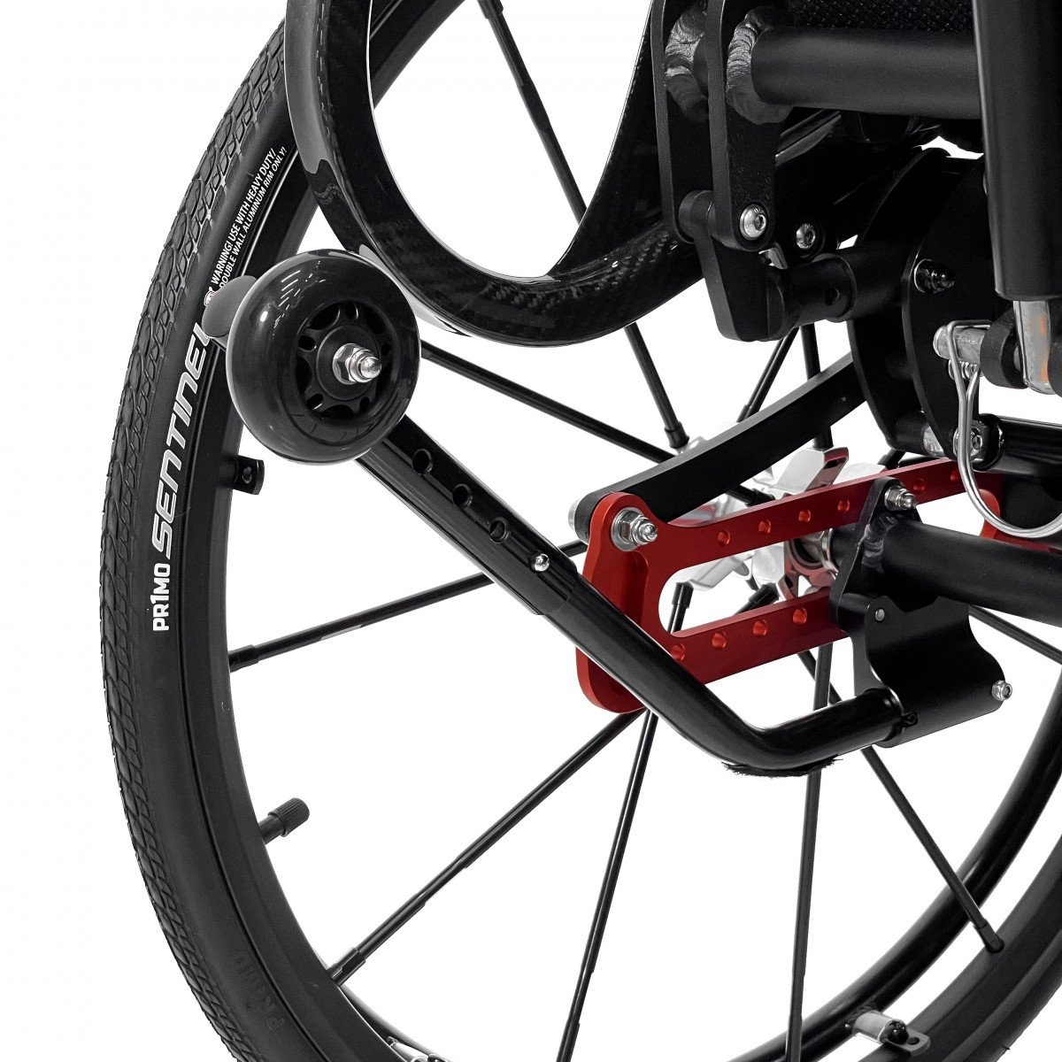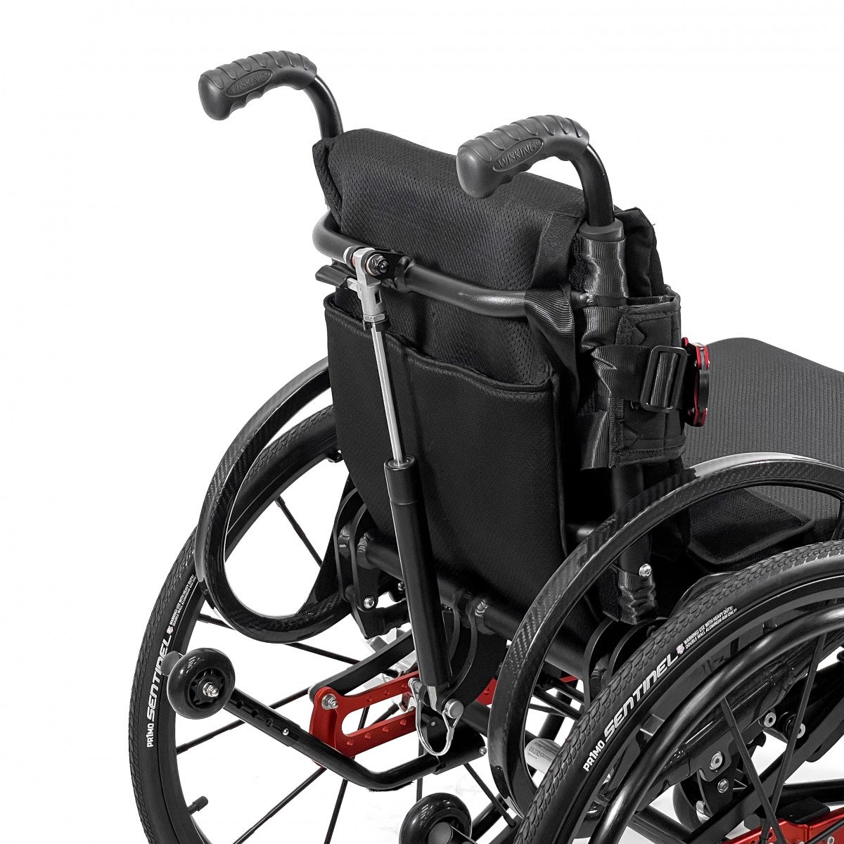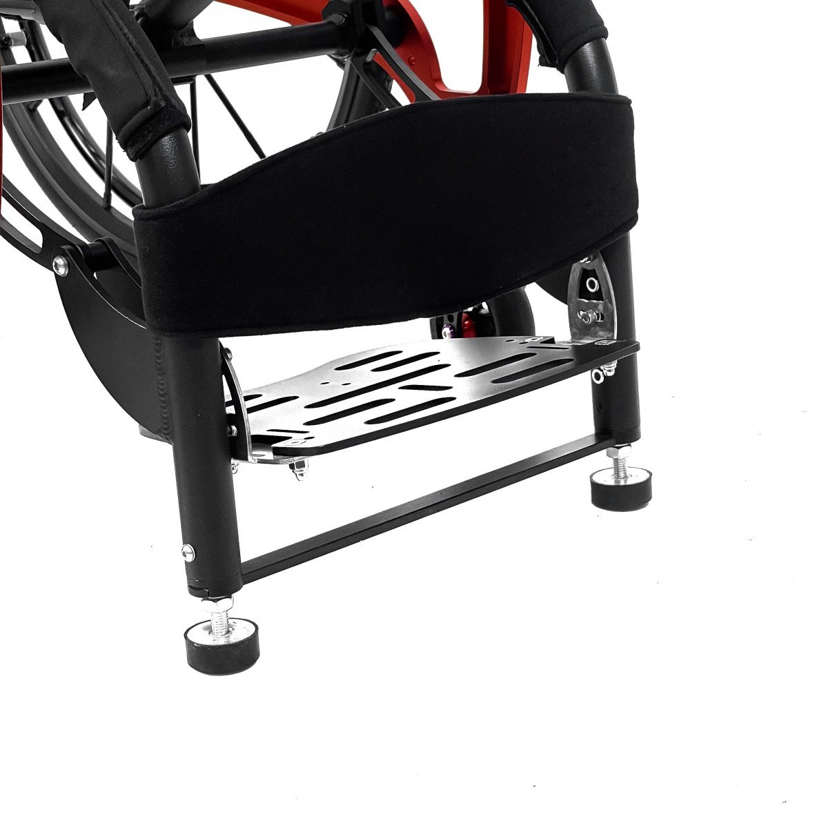 Механизм подъёма работает плавно и фиксируется в нужном положении, а ремни обеспечивают надёжную поддержку и безопасность. Вилки передних колёс регулируются по высоте, что помогает точнее настроить посадку. Обода с антискользящим покрытием упрощают управление, а стояночные тормоза обеспечивают контроль при остановке.