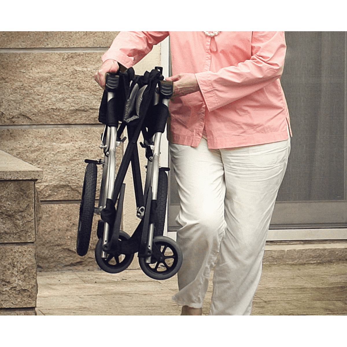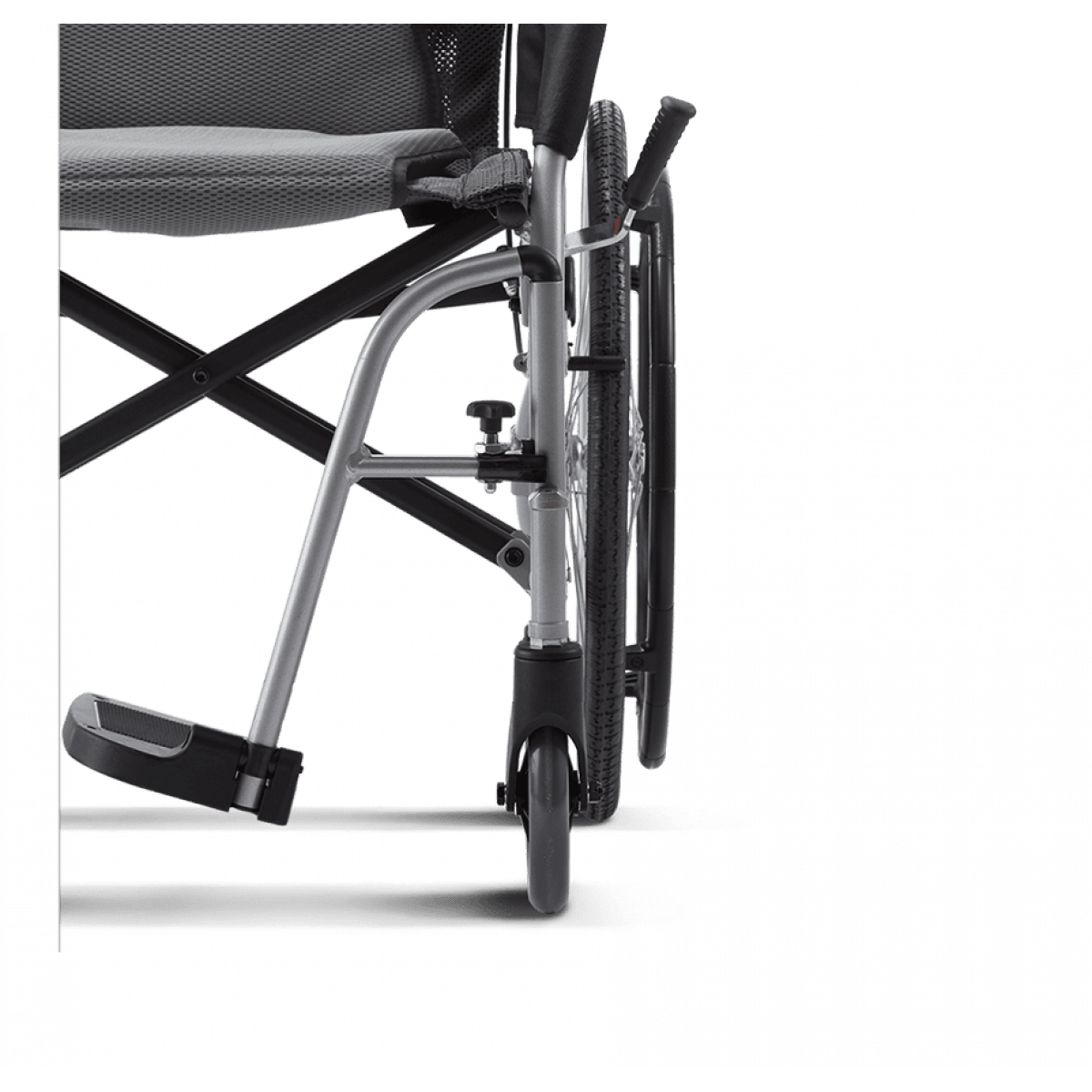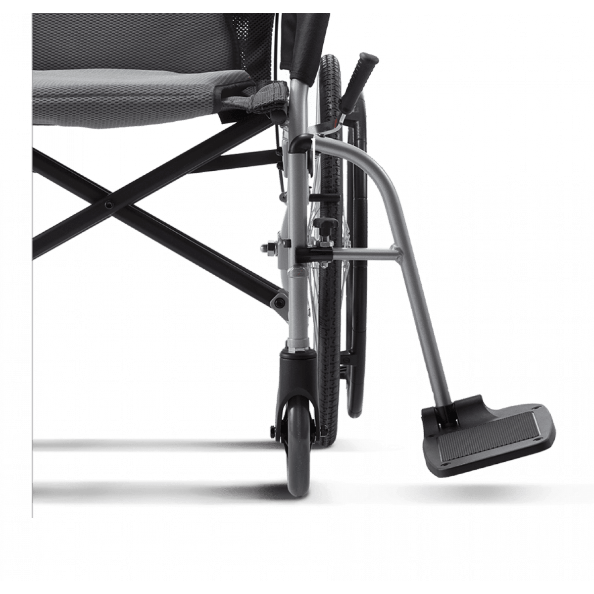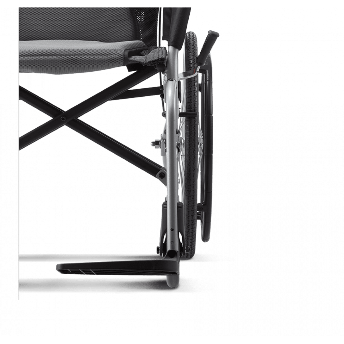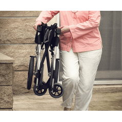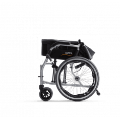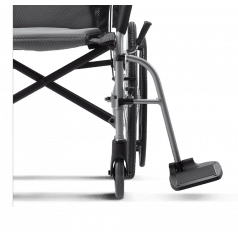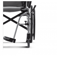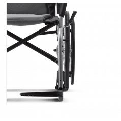 Лёгкая алюминиевая рама снижает нагрузку при подъёме и переноске. Задние колёса и подножки снимаются, поэтому коляску проще сложить, убрать в багажник или хранить дома. Откидные подножки помогают быстрее пересадить пользователя и не мешают при движении. Складная конструкция экономит место и делает модель практичной для поездок.