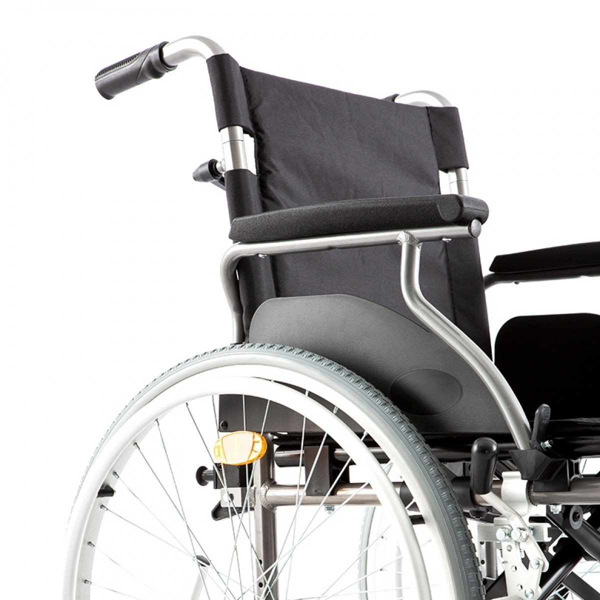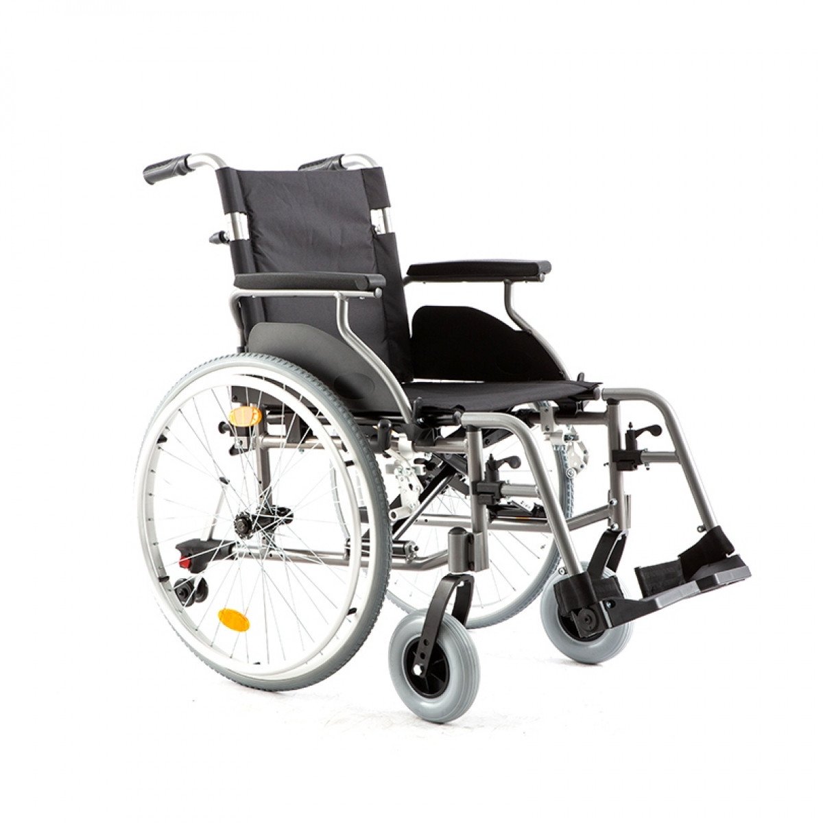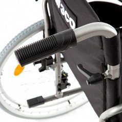 Рама выполнена из прочного металла и рассчитана на длительное использование. Задние колёса — быстросъёмные, с кнопочной фиксацией, а обода с антискользящим покрытием облегчают управление. С обеих сторон предусмотрены стояночные тормоза с возможностью регулировки, что повышает контроль и безопасность во время остановки.