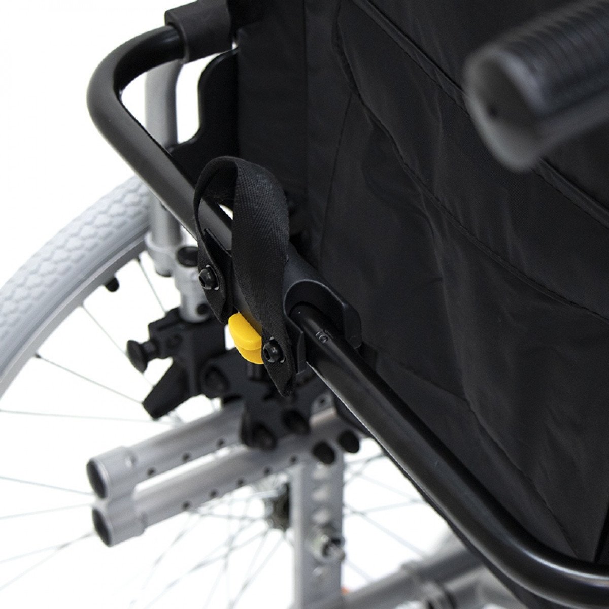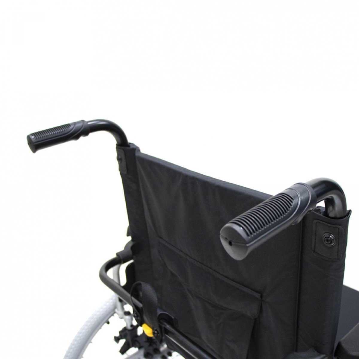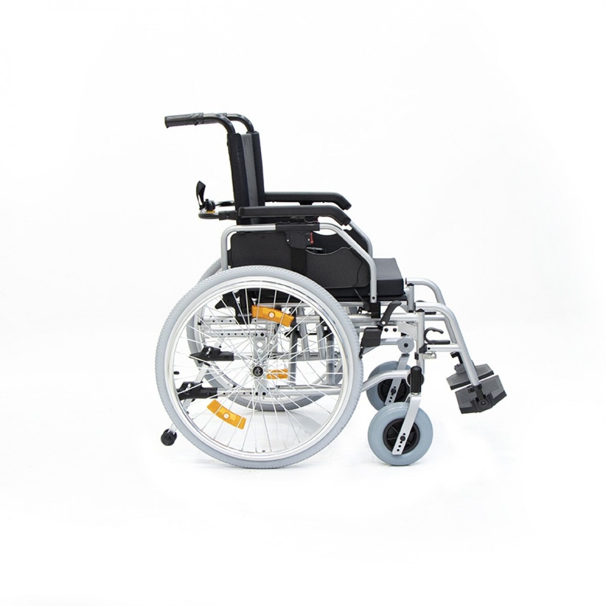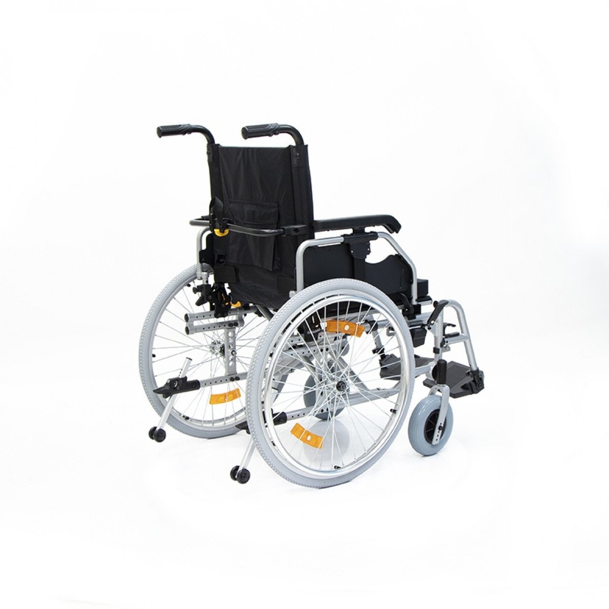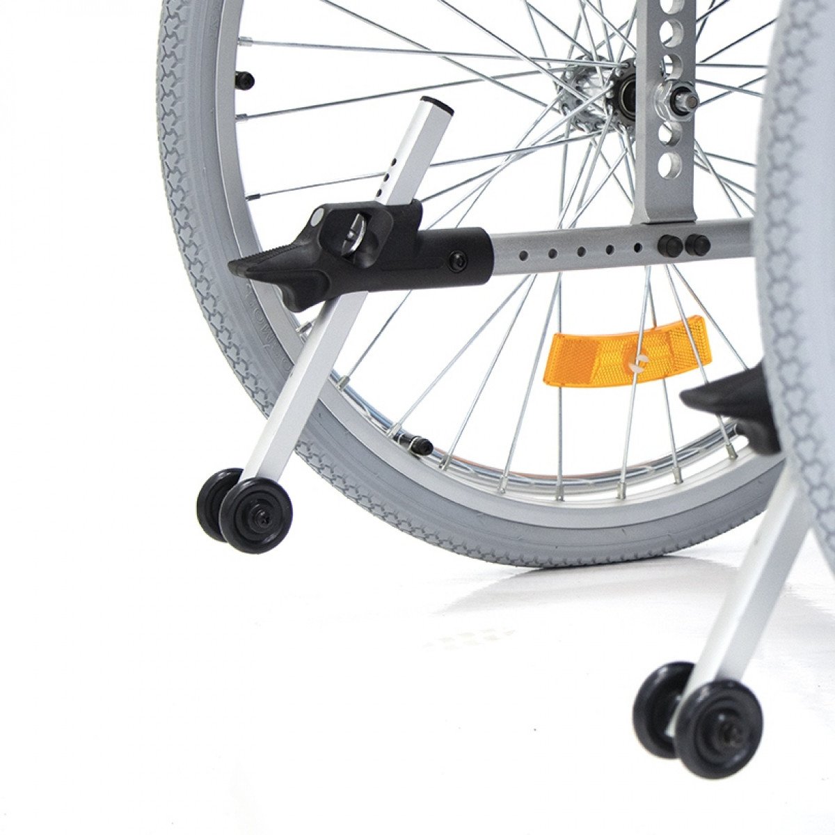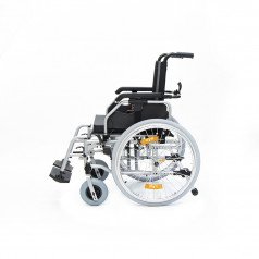 Коляска оснащена передними цельнолитыми колёсами с регулировкой по высоте и задними пневматическими колёсами, которые можно быстро снять и отрегулировать под пользователя. Складная рама из алюминия облегчает хранение и транспортировку. Для безопасности предусмотрены стояночные тормоза, жёсткая фиксация спинки и антиопрокидыватели с регулировкой, которые повышают устойчивость при движении.