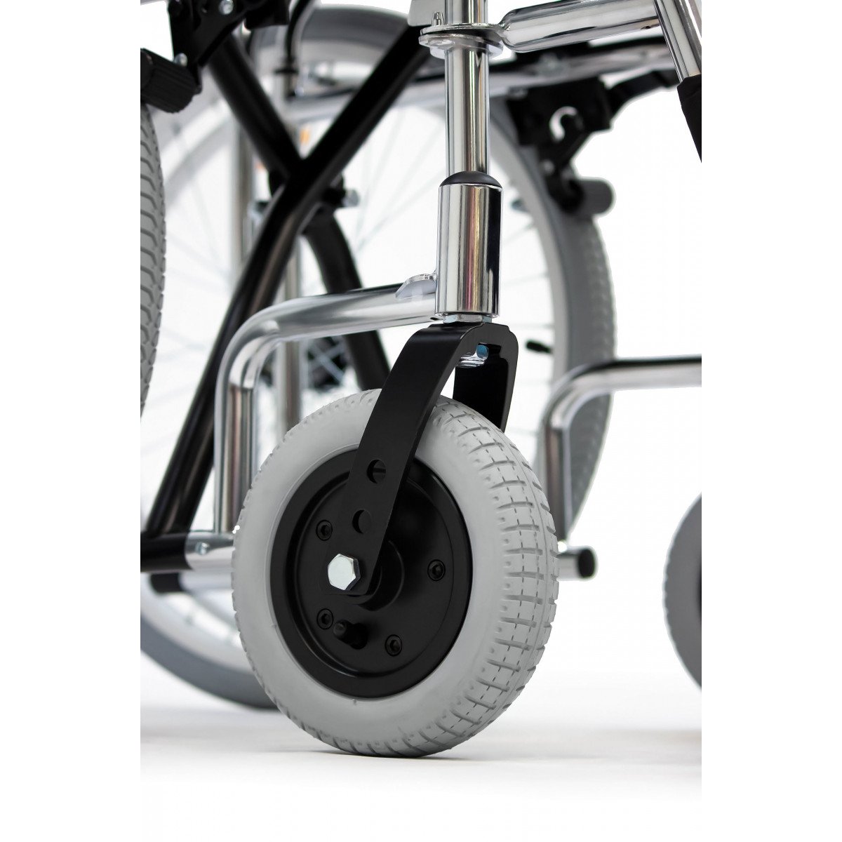 Модель подходит как для самостоятельного использования, так и для передвижения с сопровождающим. Скошенные подлокотники позволяют подъехать вплотную к столу и занять удобное положение. Коляска складывается вместе со спинкой, поэтому её удобно хранить дома и перевозить в автомобиле.