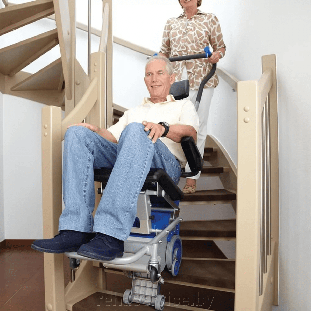 Лестничный подъёмник Sano PT S 160 (Сано ПиТи Эс 160) создан для безопасного перемещения людей по лестницам в условиях ограниченной мобильности. Модель оборудована встроенным креслом с подлокотниками и подножкой, а также регулируемым подголовником, что делает поездку более удобной и устойчивой. Управление осуществляется с помощью кнопок, расположенных по обе стороны рукоятки, что позволяет сопровождающему легко контролировать процесс.