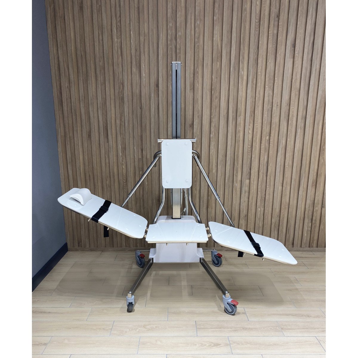 Конструкция выполнена на прочной металлической основе и оснащена подъёмным механизмом, который поднимает и опускает ложе нажатием одной кнопки. Трёхсекционная платформа регулируется по высоте и углу наклона, что помогает выбрать удобное положение для каждого пациента. Благодаря компактным размерам и маневренным колёсам подъёмник легко перемещается между помещениями, не занимая много места.