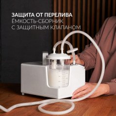 Корпус отсасывателя выполнен из прочного и легко моющегося пластика, что упрощает уход и продлевает срок службы прибора. Ёмкость-сборник оснащена клапаном, который предотвращает перелив жидкости, а встроенный антибактериальный фильтр обеспечивает дополнительную защиту от загрязнений.