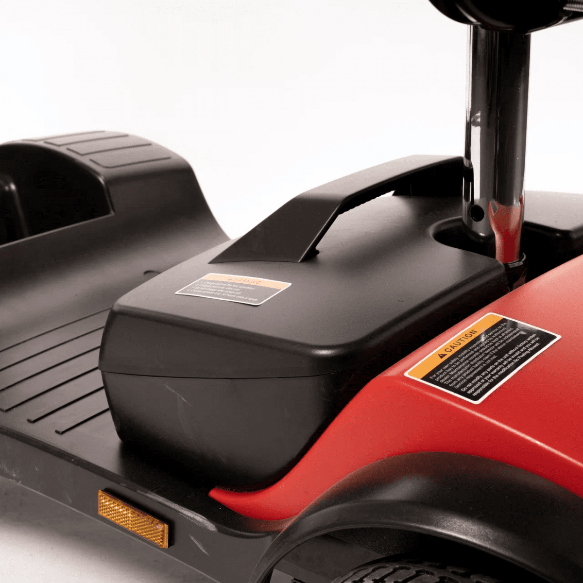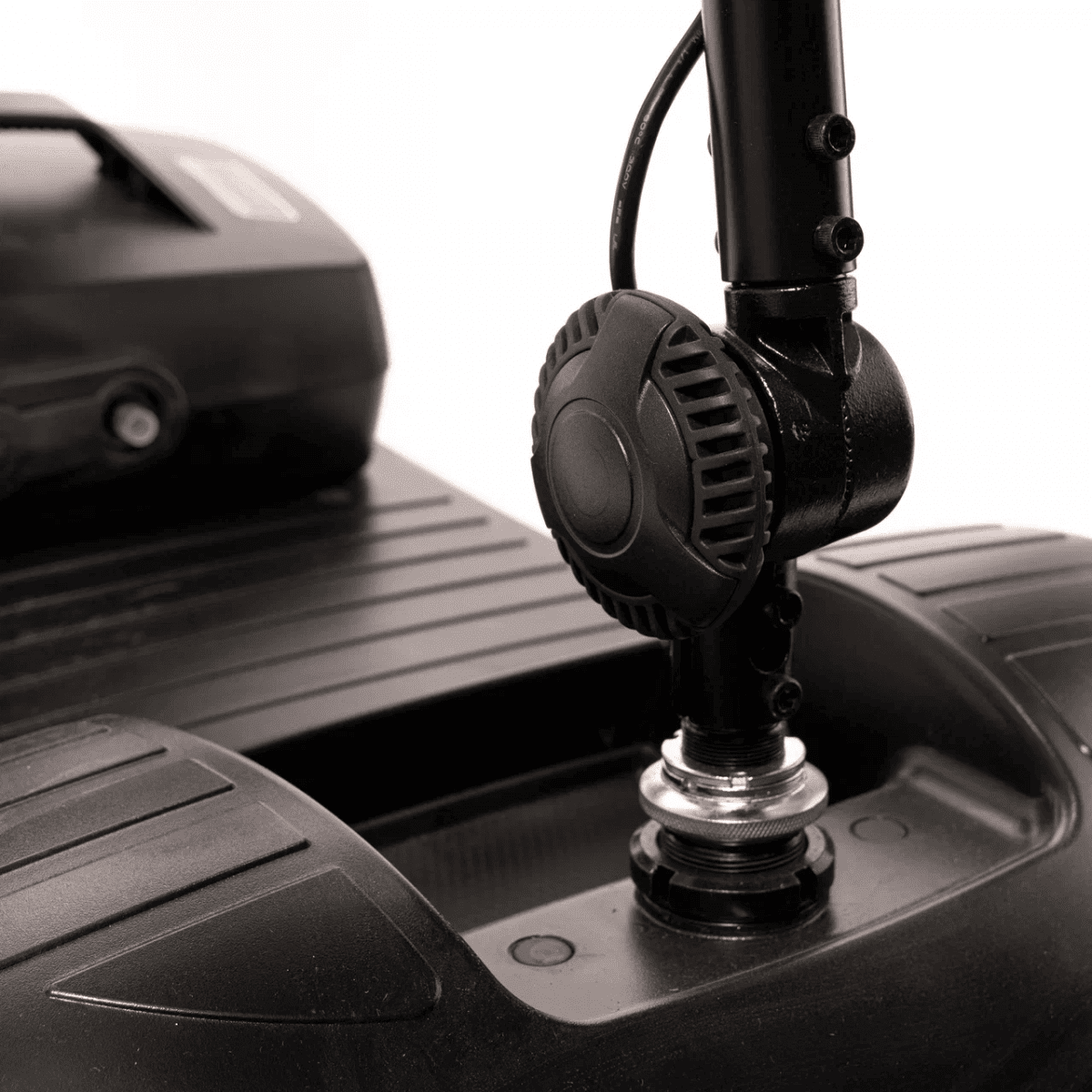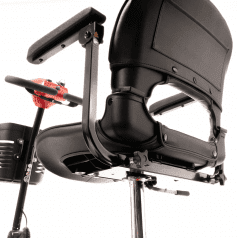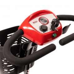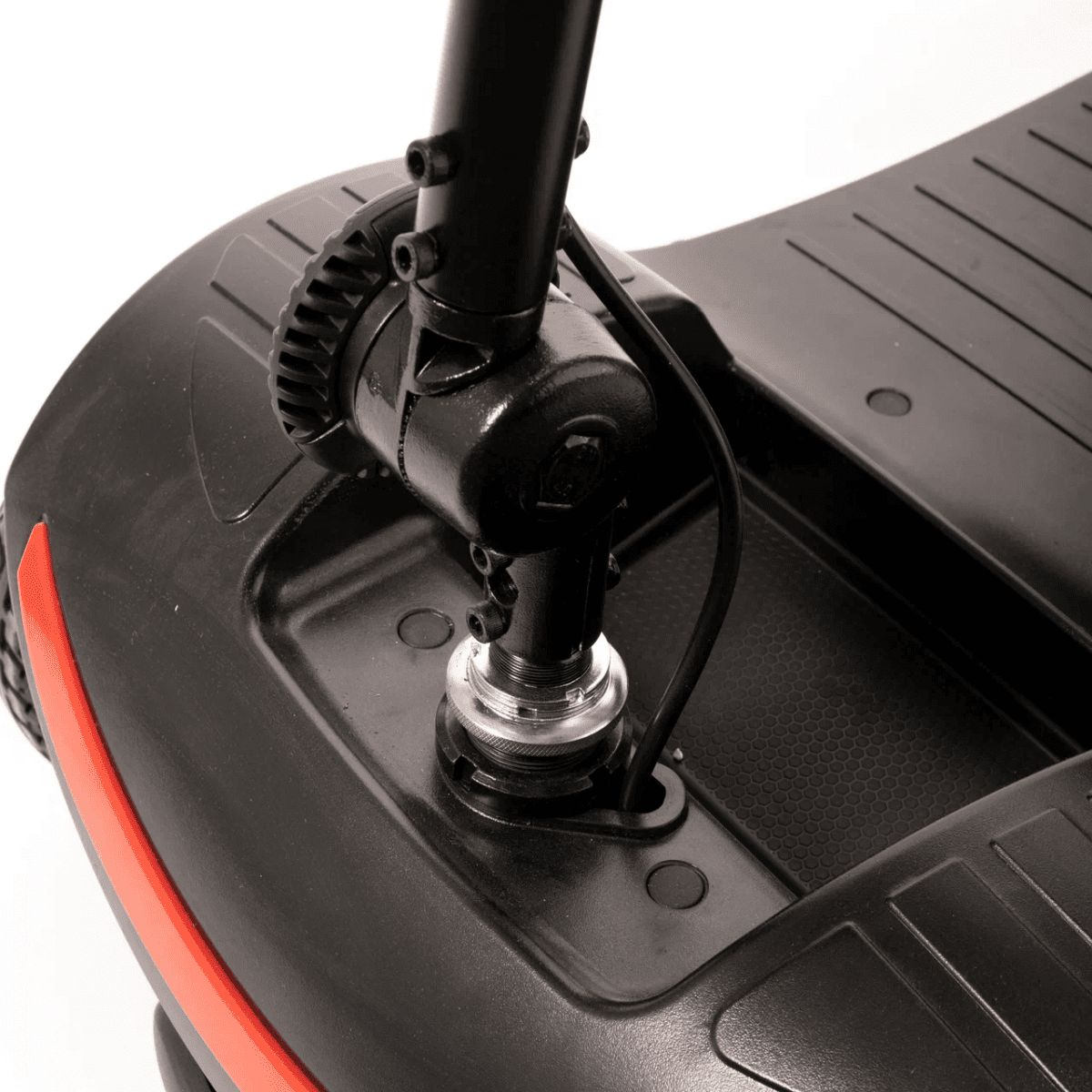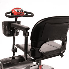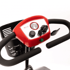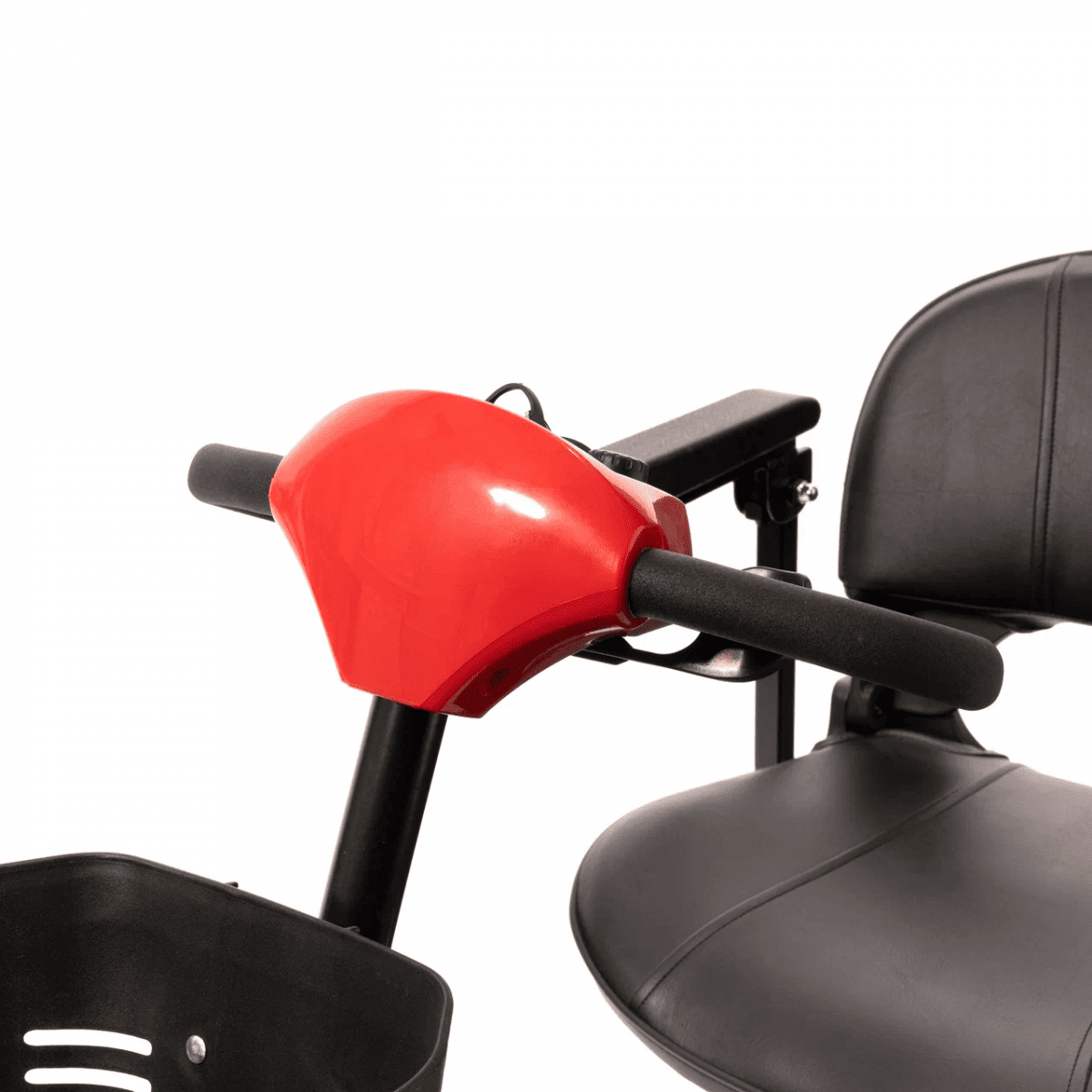 Скутер оснащён удобным рулём с панелью управления, где расположены ключевые функции: переключатель «включить/выключить», индикатор заряда батареи, регулятор скорости, звуковой сигнал и акселераторы. Поворотное сиденье с откидывающимися подлокотниками гарантирует дополнительный комфорт при посадке.
