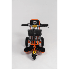 Управление интуитивно понятное: на рулевой колонке расположены дисплей и кнопки, поворотное кольцо для контроля движения, переключение направления вперёд и назад, а также рычаг дискового тормоза. Мотор-колесо обеспечивает уверенное движение, а задние колёса добавляют устойчивости. Все элементы конструкции продуманы так, чтобы скутером было удобно пользоваться каждый день — без лишних усилий и сложных настроек.