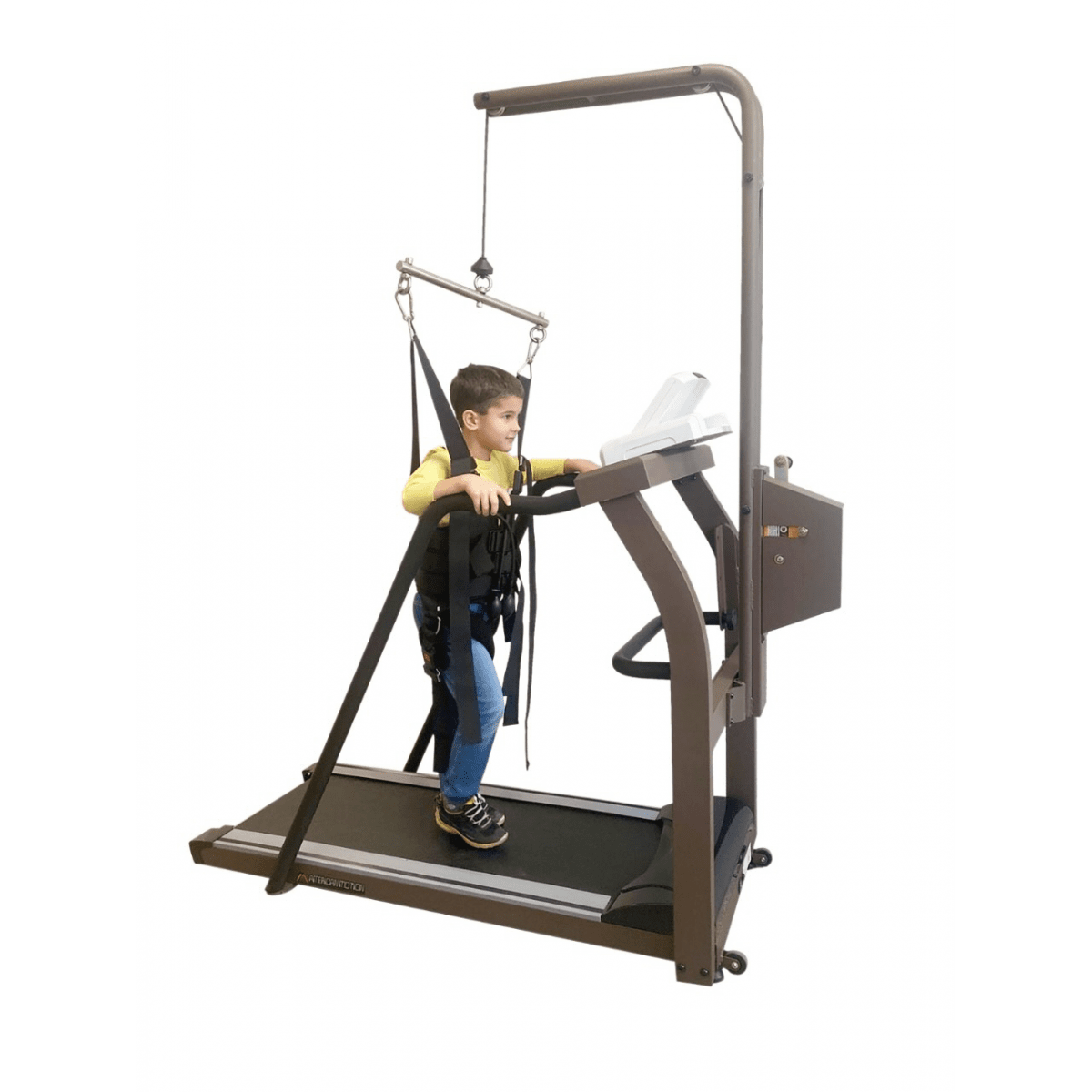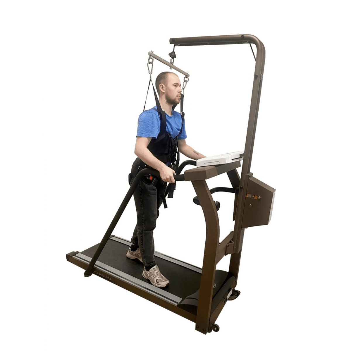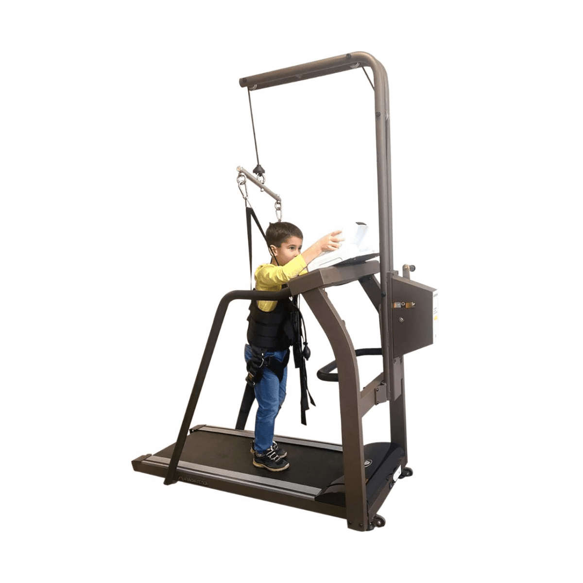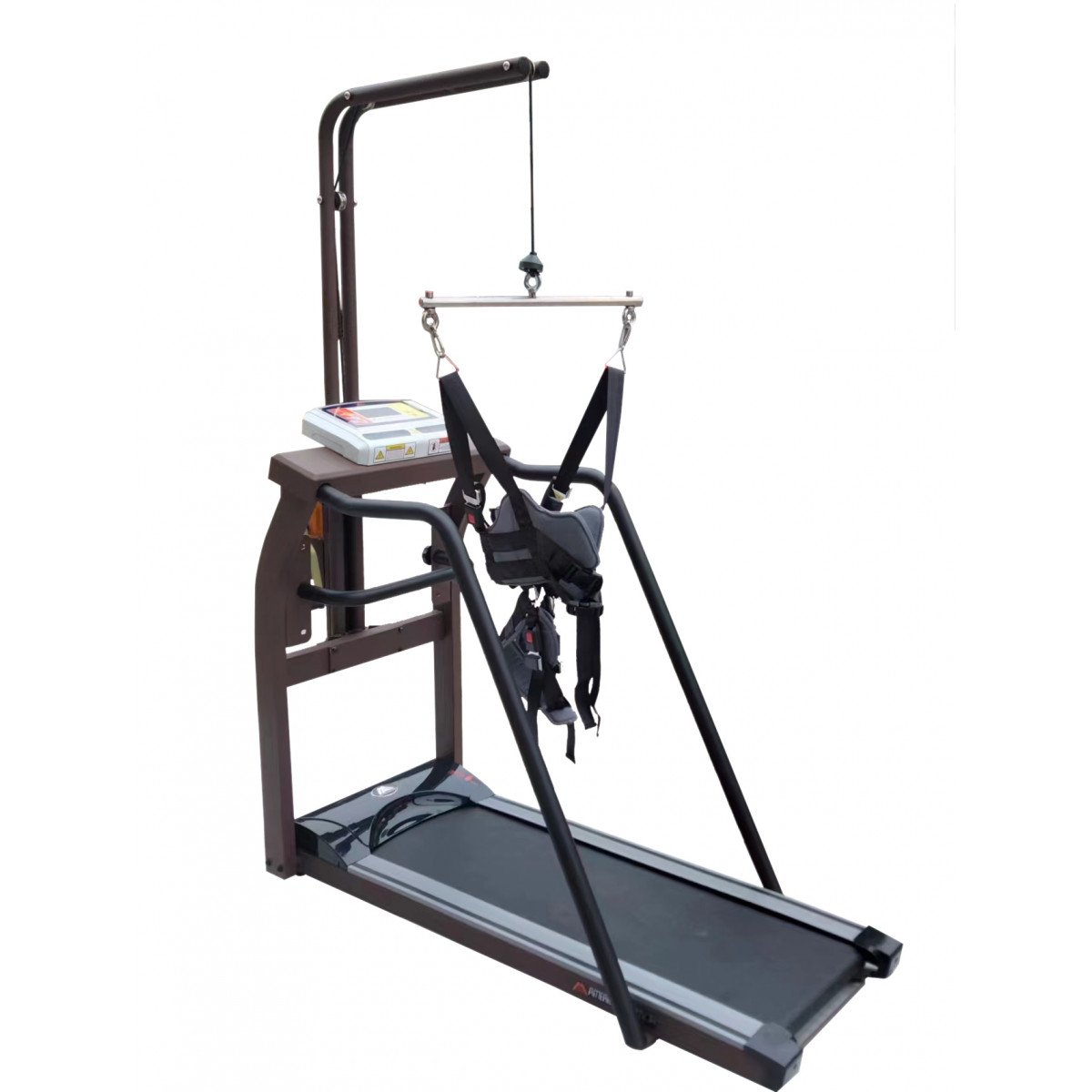Регулировка подвеса осуществляется вручную — достаточно повернуть рукоятку. Крепление жилета можно установить на высоте 100–170 см от бегового полотна, что удобно для пользователей разного роста и возраста. При необходимости тренировки проводятся и без подвеса: мощный мотор выдерживает нагрузку до 120 кг, сохраняя плавность и устойчивость работы.