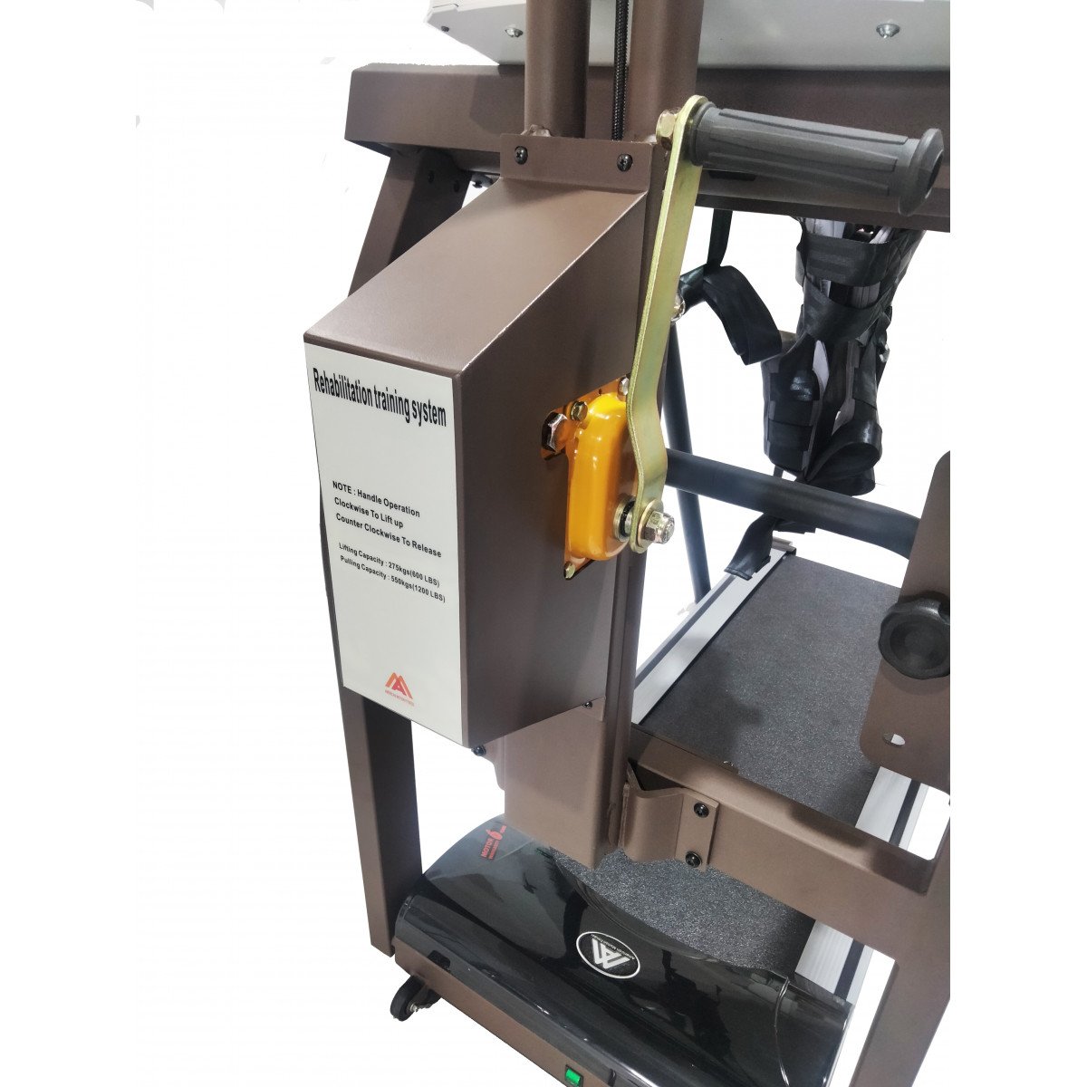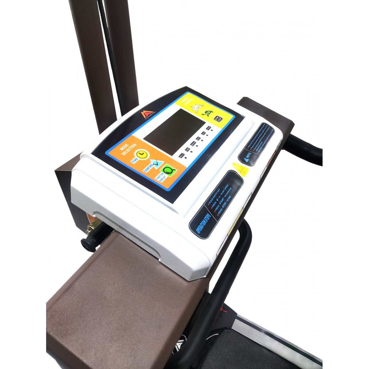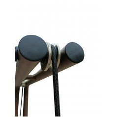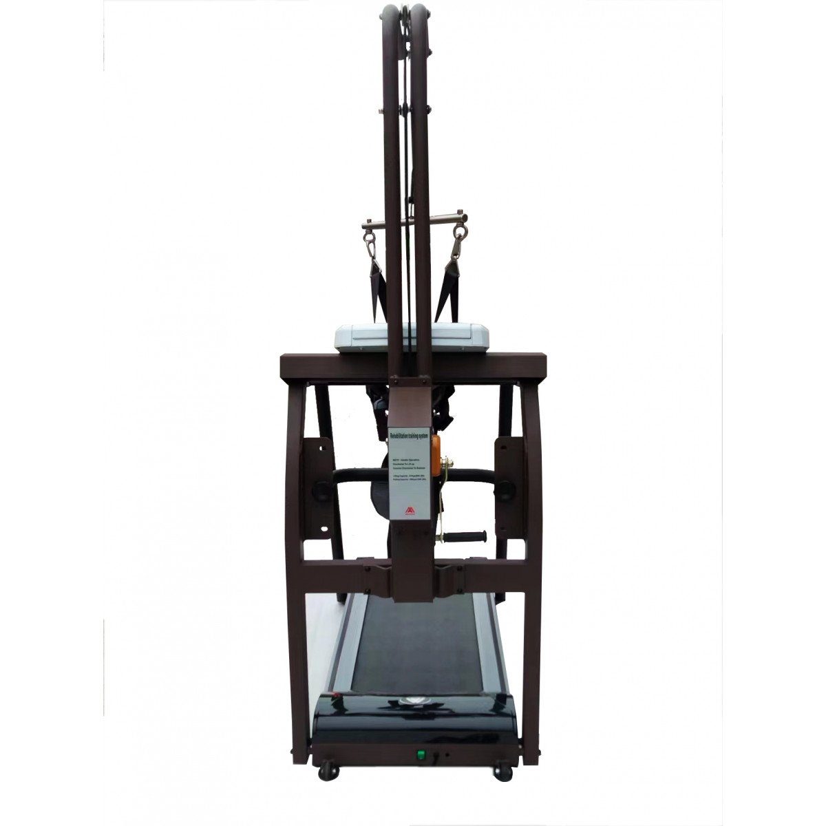 Регулировка подвеса осуществляется вручную — достаточно повернуть рукоятку. Крепление жилета можно установить на высоте 100–170 см от бегового полотна, что удобно для пользователей разного роста и возраста. При необходимости тренировки проводятся и без подвеса: мощный мотор выдерживает нагрузку до 120 кг, сохраняя плавность и устойчивость работы.