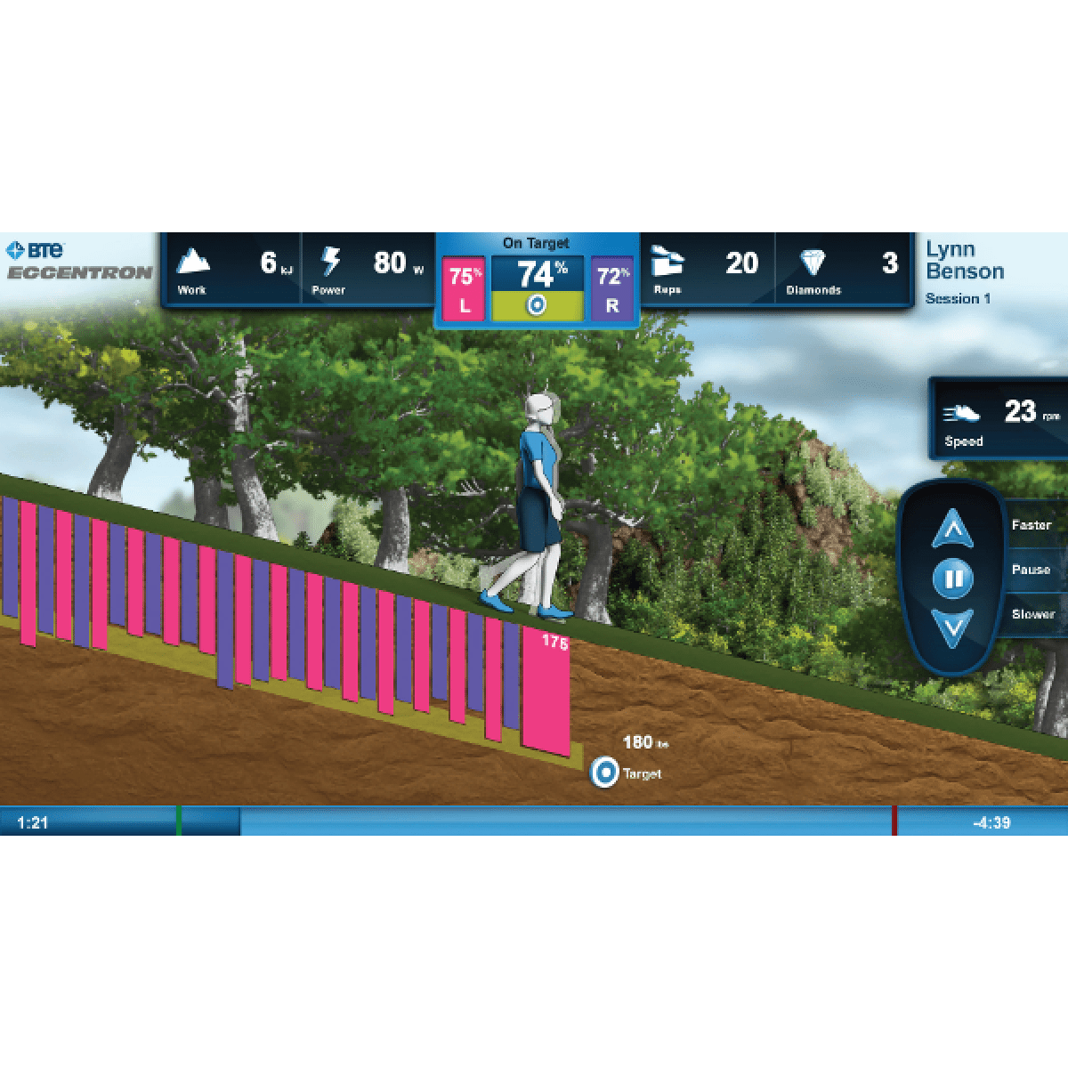 Тренажёр имитирует нагрузку, возникающую при спуске с наклонной поверхности, что особенно полезно для пользователей с нарушениями локомоции. Eccentron помогает восстановить подвижность, эффективно тренируя мышцы с минимальной нагрузкой на суставы. Система позволяет выполнять упражнения с меньшим весом, но с высокой эффективностью, что безопасно для пользователей, имеющих противопоказания к занятиям в тренажёрных залах.